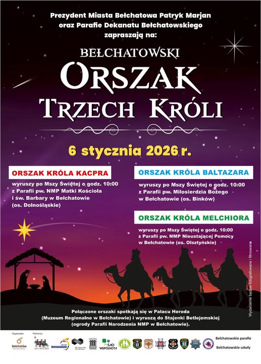 Prezydent Miasta Bełchatowa Patryk Marjan oraz Parafie Dekanatu Bełchatowskiego zapraszają na Bełchatowski Orszak Trzech Króli - 6 stycznia 2026 r.